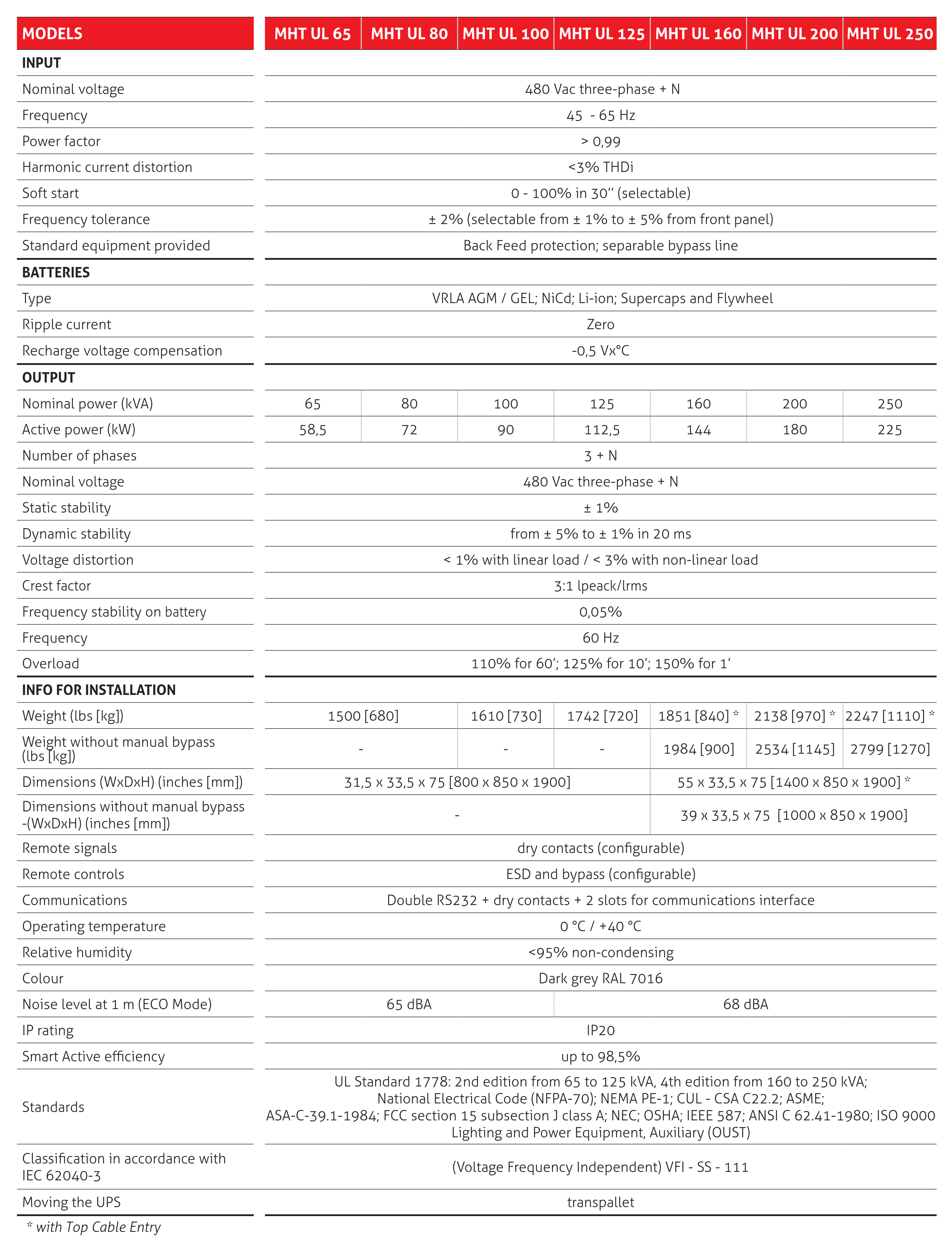 Top performances and protection. The incredible levels of quality, reliability and energy savings offered by the Master HP range of UPS have been extended to include a 480 Vac - 60 Hz version, certified as UL, with power ratings from 65 to 250 kVA. IT department managers, facility managers and CTOs are under increasing pressure to achieve zero downtime and to size data centre or industrial installations to be flexible in the face of continuous changes and expansion. As the search for the most reliable and efficient power supply system becomes ever-increasingly critical, Riello UPS has been continuously investing in power solutions to meet the demands of a range of our clients; a commitment that resulted in the Master HP UL range. More than just an innovative and technologically-advanced UPS, it is a leap into the future of three-phase technology. Thanks to its double conversion on-line technology based entirely on IGBT and digital signal processors (DSP), the Master HP UL range ensures maximum power supply protection and quality for any type of load, IT or industrial, in particular for mission critical applications, with VFI SS 111 classification (Voltage and Frequency Independent) in accordance with IEC EN 62040-3. This range was designed using a new configuration that includes an IGBT sinusoidal input rectifier instead of the conventional thyristor system. Differently from other UPS technologies available on the market, double conversion technology with galvanic isolated output guarantees a quality power supply that is completely protected from all electrical anomalies at the input. Even in the event of serious power supply problems, the output power remains stable. |